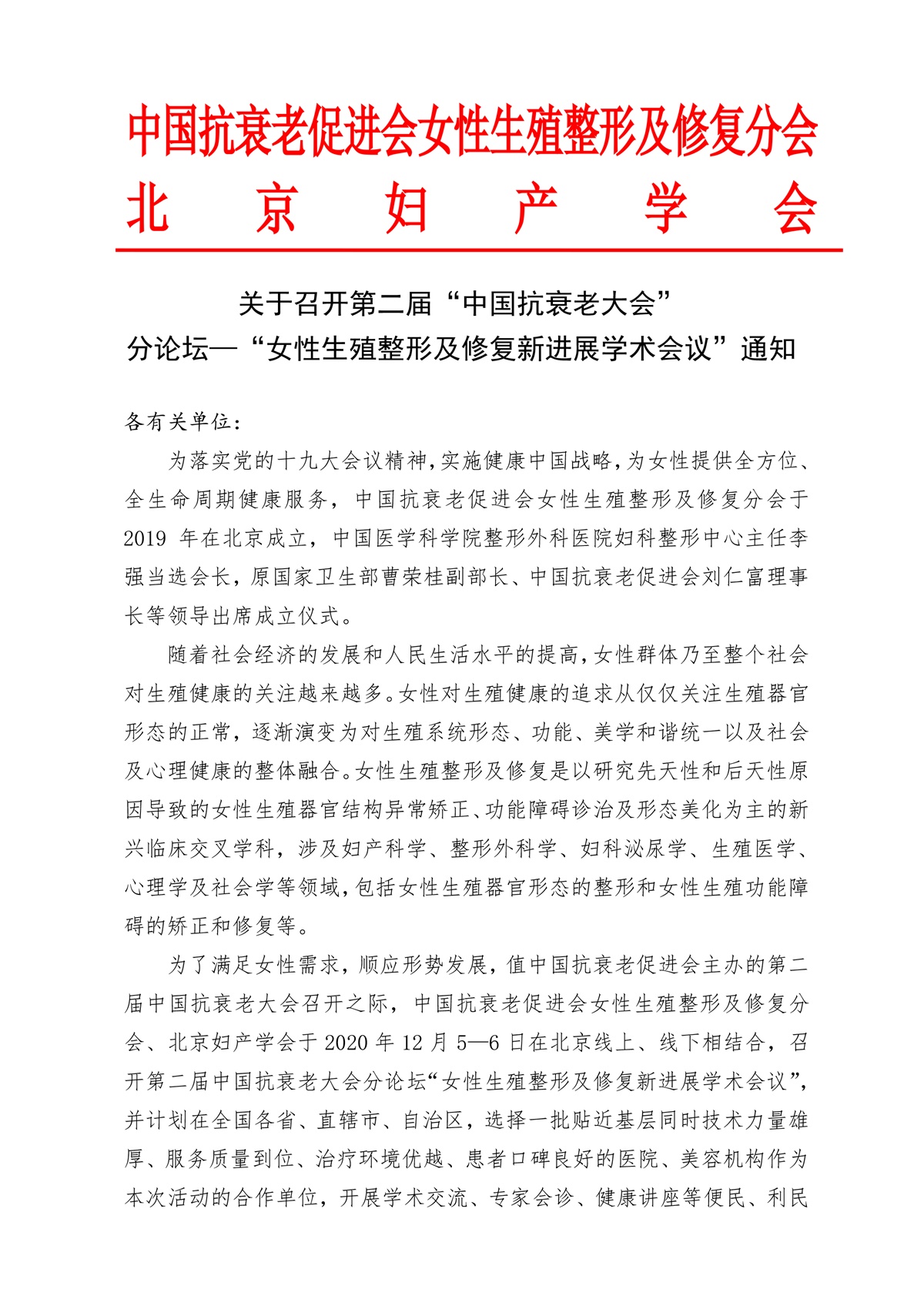 第二届“中国抗衰老大会” 分论坛“女性生殖整形及修复新进展学术会议”通知